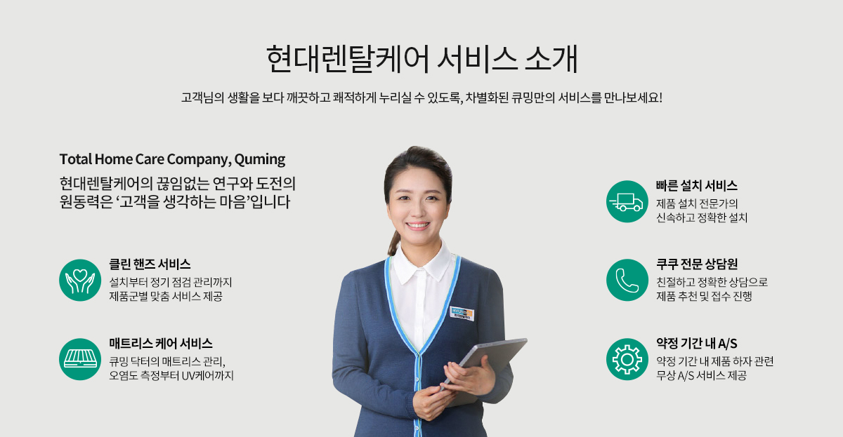 생활의 현대렌탈케어, 지속적인 품질의 고급화와 기술력 혁신을 통하여 글로벌 기업으로서 비전을 실현해가고 있습니다.